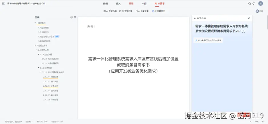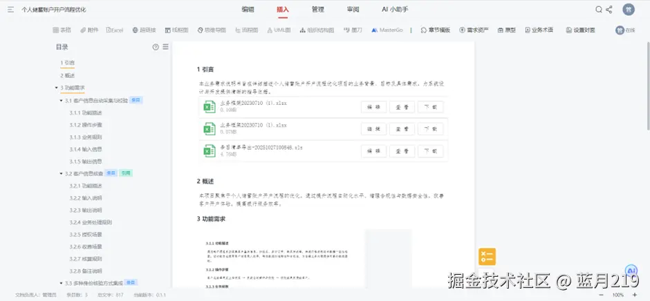 🤖 AI 小助手功能:编写过程中,AI 小助手全程陪伴。用户可随时提问(如 “新核心系统下转账业务数据校验规则”),小助手会基于全文内容提供精准解答;同时,还能主动提示格式规范、逻辑漏洞,辅助用户规避常见编写问题。
