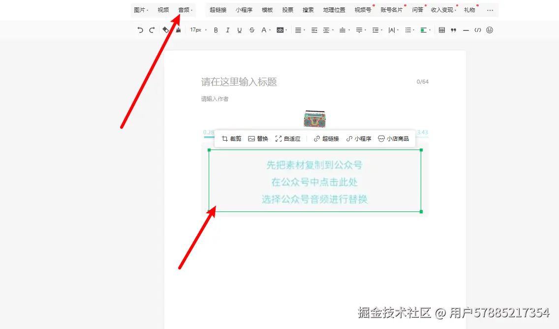 - 回到公众号后台,选中粘贴过来的样式里的文字,或者直接点样式本身,会出现「插入音频」的按钮,点一下就能选——要么上传自己提前准备好的音频,要么直接搜索想听的音乐,选中后点「确定」就行;