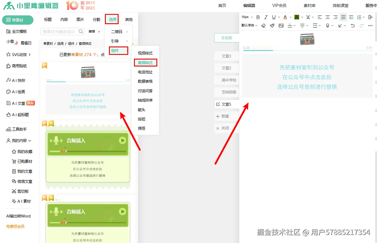 - 先打开小墨鹰编辑器,左边找「单素材」→ 点「选用」→ 再选「组件」→ 找到「音频样式」,里面有不少好看的音乐边框模板,挑个喜欢的点一下,就添加到编辑区啦;