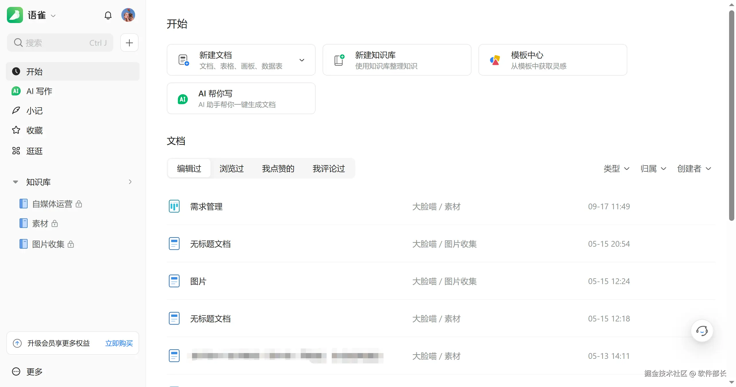 - 特点:语雀是阿里内部使用后开放给大众的文档协作工具,支持文档归类知识沉淀,有强大的文档编辑器,覆盖文档办公的全部工具,包括文档、表格、PPT、思维导图、流程图等。同时,它支持电脑端、iPad端、手机端内容同步,方便用户随时随地进行文档编辑和查看。