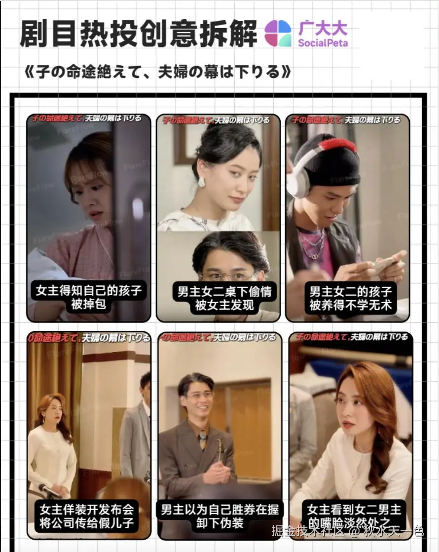 这段素材可谓全程高能:开头男主女二密谋换子,观众本以为又是善良女主被骗的老套路,结果立刻反转——女主早已洞悉一切,暗中布局复仇;中期女二儿子长大不学无术,女主竟然答应传公司给他,让人心头一紧,怕她突然降智;好在结尾女主果然留有后手,片段戛然而止,令人好奇她将如何完成绝地反击。
