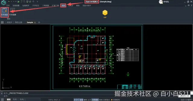 之前使用过咱们浩辰CAD看图王电脑版的小伙伴都知道,在界面的左侧是咱们的项目面板,本身是为了方便大家项目交流,但是我们收到一些小伙伴的反馈,说项目面板放在这里比较碍事,我们听取大家的意见,在浩辰CAD看图王电脑版9.6版本中将项目面板设置成默认隐藏不显示的状态,需要使用的小伙伴可以在【项目】菜单栏进行【打开项目】操作。