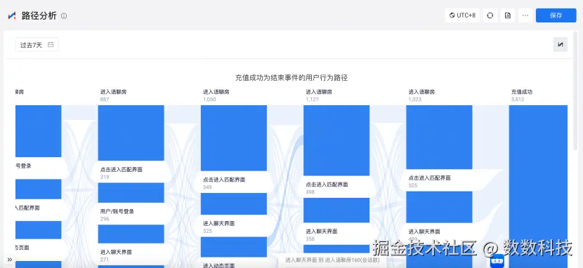 数数科技的游戏大数据引擎 ThinkingEngine(简称“TE 系统”)的“路径分析”模型可以支持“结束事件”的选择,在 TE 系统中,我们可以选择付费终止事件作为用户行为的终点,这样就能很清楚地看到用户在付费之前都做了些什么。