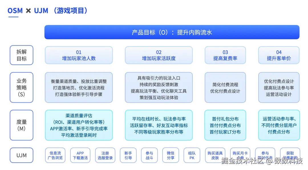 对游戏来说,数据分析的核心聚焦于理解行为渗透与付费转化这两个关键维度。为实现精准分析,这需要建立一套完整的指标体系,通常会采用 OSM (Object, Strategy, Metrics) 或者 GSM (Goal, Signal, Metrics) 模型,两种模型分别代表了两种不同的从业务目标出发拆解指标的思维方式。