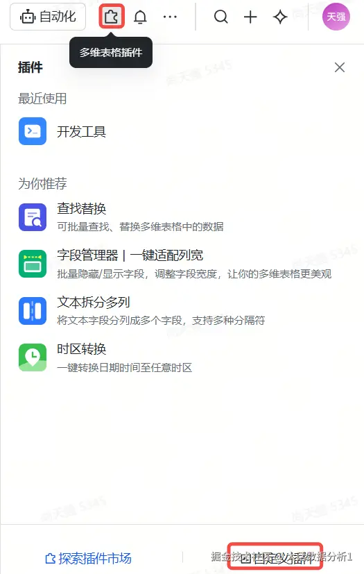 要想将本地数据自动上传到飞书多维表格,还是用Python写代码实现,但是,需要提前获取你保存的飞书多维表对应的对应的授权码,打开飞书多维表格,新建一个多维表,在右上角点击多维表格插件,点击自定义插件。