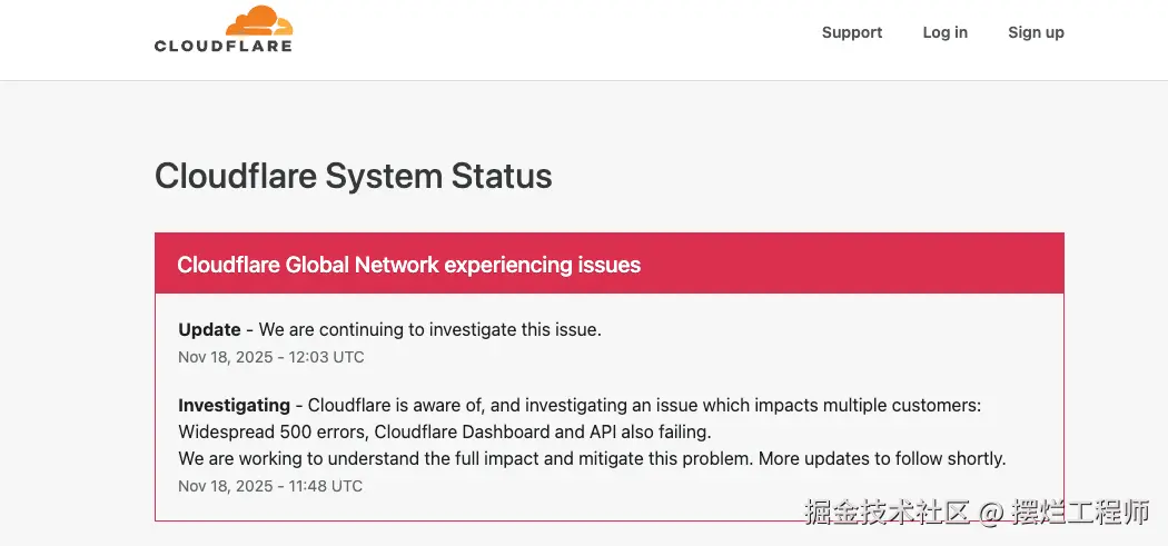 - 刷新状态页面、社交公告。Cloudflare 官方在其状态页已说明:他们“意识到问题,正在调查并缓解中”。