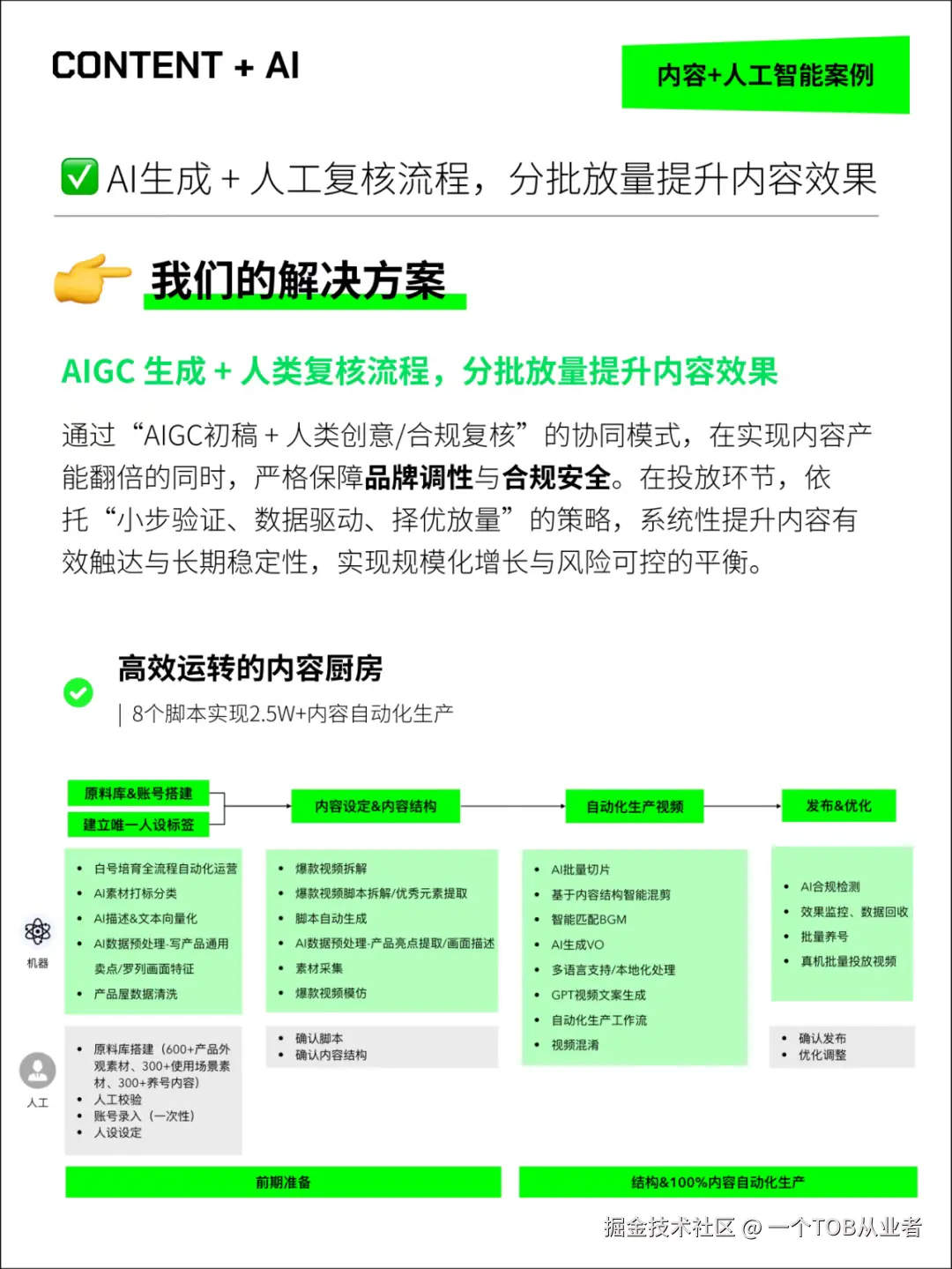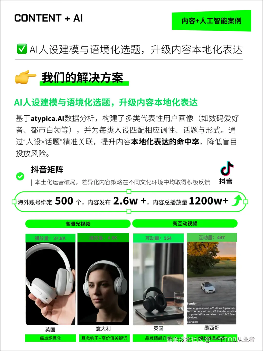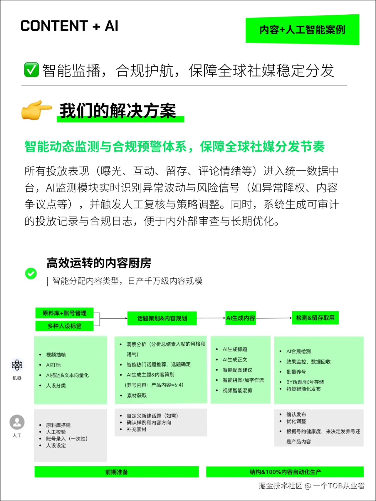 - 数据更优异:账号存活 / 活跃率从初始的 68% 提升至 95%,增长 27 个百分点;内容限流率从 11% 降至 3.4%,降幅达 70%;单条平均播放量提升 1.8 倍,内容互动率提升 2.3 倍,实现规模化与高质量的双重突破。