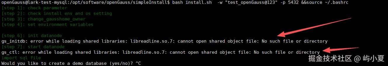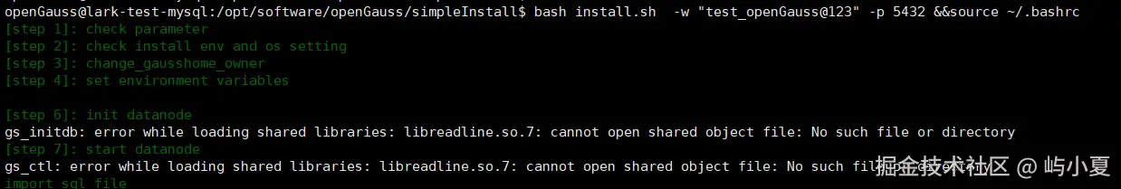 但是openGauss的安装脚本运行中依赖的是旧版本的libreadline.so.7库文件,版本不兼容导致部署失败