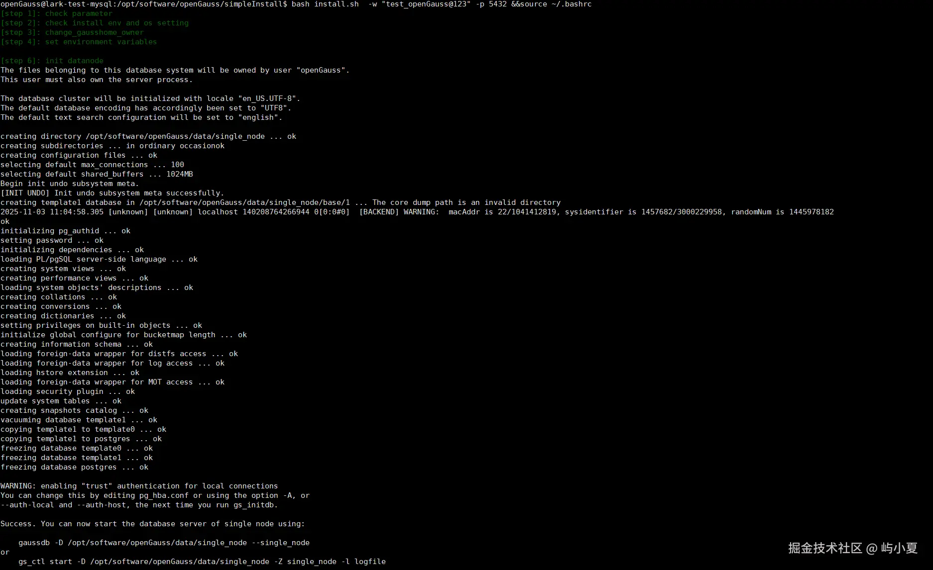 sh install.sh -w "test_openGauss@123" -p 5432 &&source ~/.bashrc