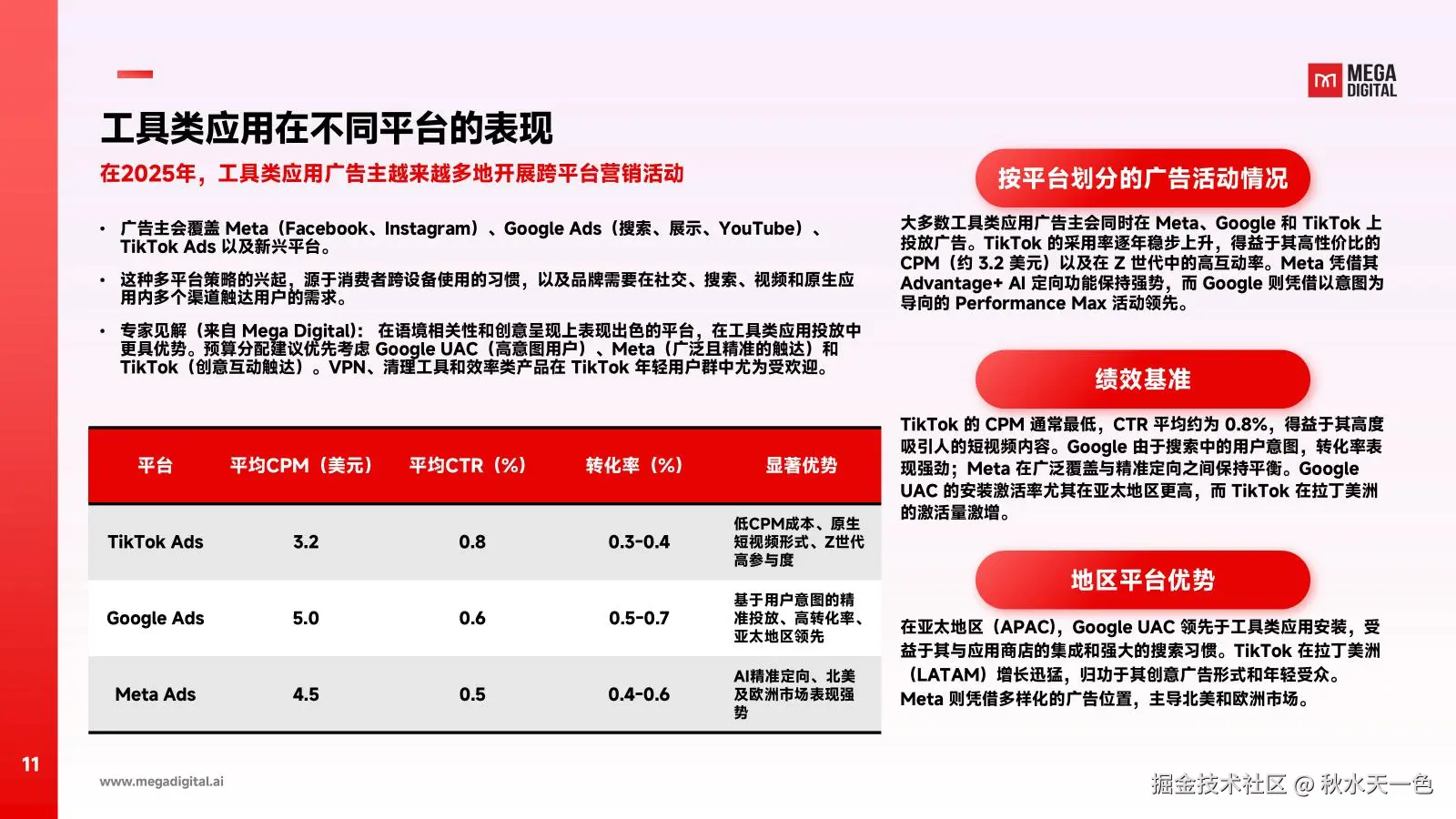 对于广大工具类广告主来说,核心是在竞争激烈的市场里得用跨平台投放策略。在平台选择上,用Google触达有明确需求的用户,靠Meta做精准投放,通过TikTok搞创意互动。成功的关键是多用视频、互动类广告,再结合 AI 来优化和快速更新创意。