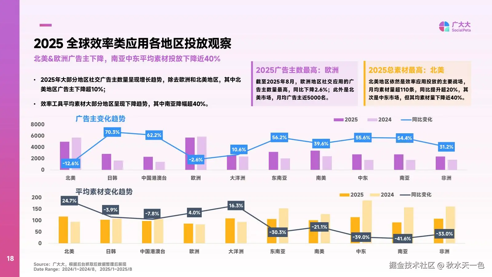 区域市场的分化更为显著。欧洲仍是效率类广告主数量最多的地区,月均规模领先全球,但同比已出现2.6%的小幅下滑;北美则展现出强劲的投放活力,月均素材量突破110条,同比提升超20%,成为效率工具的核心展示舞台。值得注意的是,东南亚、非洲等新兴市场广告主数量稳步增长,而南亚、中东的素材投放量却分别下降41.6%和39.0%,精准匹配区域需求成为投放关键。