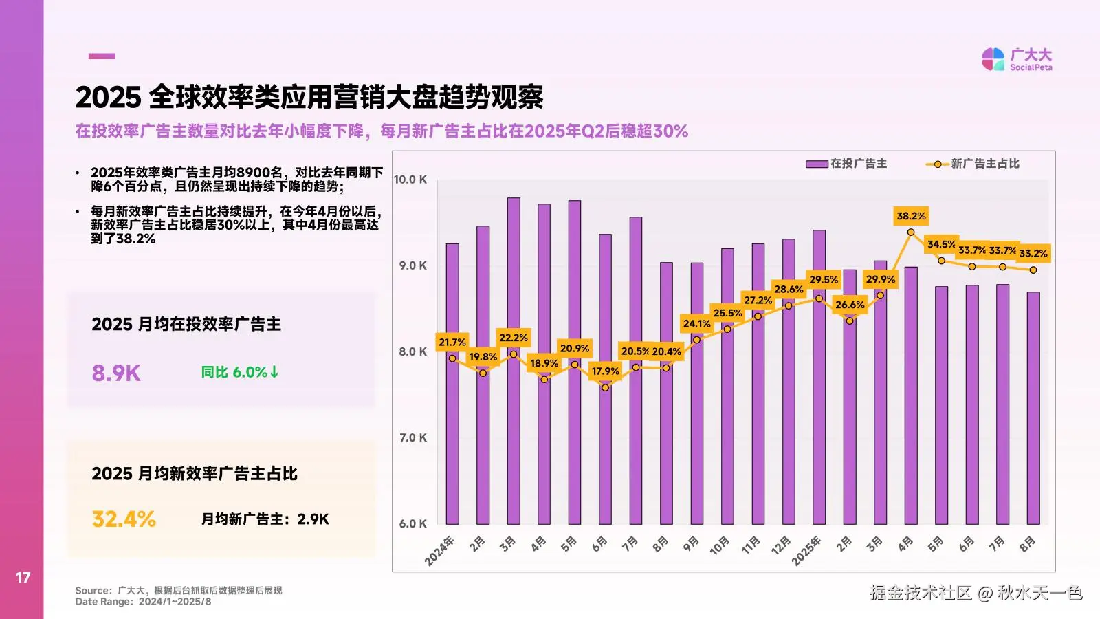 2025年的效率工具市场呈现出鲜明的“洗牌特征”。数据显示,全球效率类广告主月均规模为8900名,较去年同期下降6个百分点,行业正经历存量优化阶段。但新玩家的入场热情并未减退,4月以来新广告主占比持续稳定在30%以上,最高达38.2%,每月新增广告主超2900名,新鲜血液正在重构市场格局。