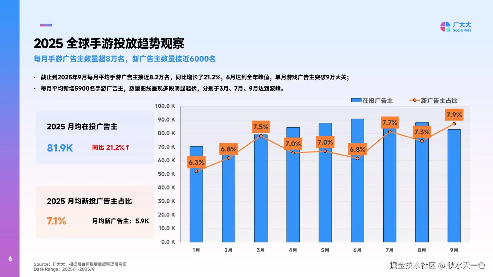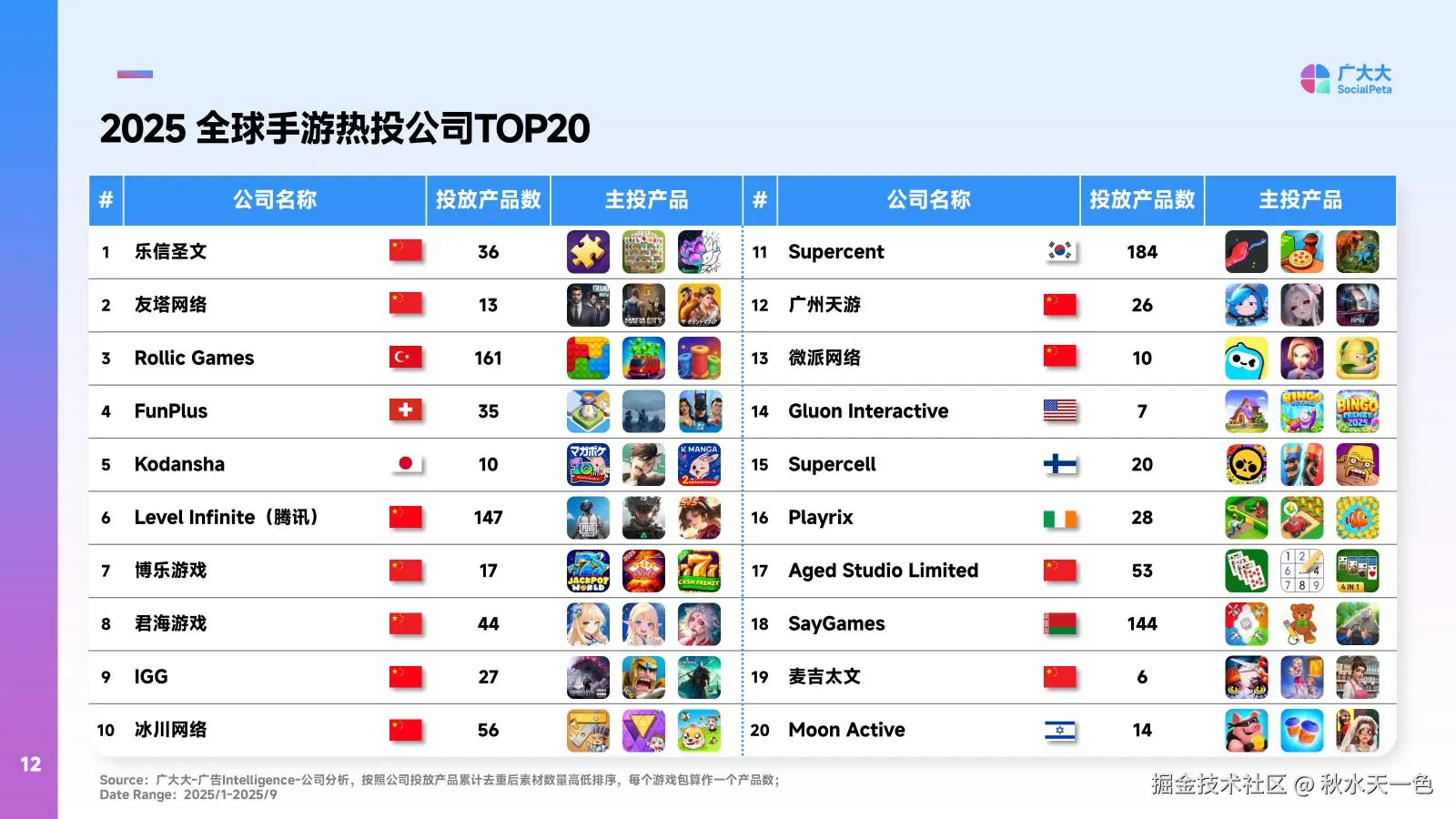 回顾2025年前三个季度,我们清晰地看到:中重度手游出海市场在回暖,竞争也在加剧。全球手游每月平均有超过8万家公司在积极投放广告,中国厂商在前十强中强势占据七席——出海,还是游戏厂商的“必答题” 。