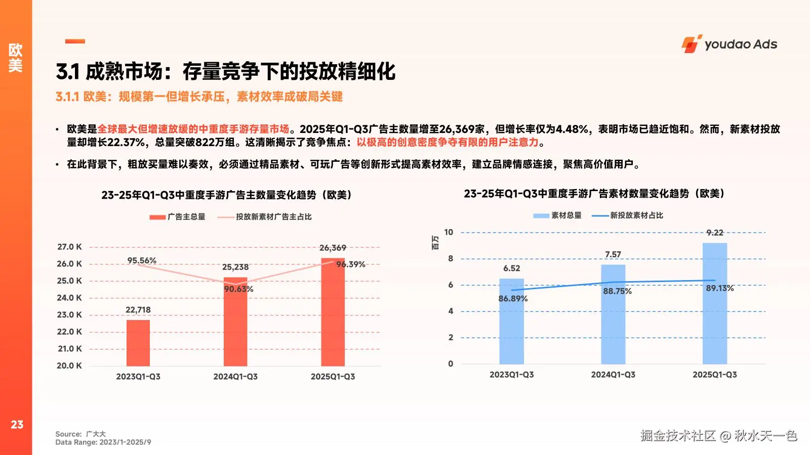 以欧美市场为例,从近三年的数据来看,规模第一的欧美市场已进入“饱和期” ——2025年Q1-Q3广告主数量26369家,同比仅增4.48%。然而,新素材投放量却增长22.37%,广告主正以极高的创意密度争夺有限的用户注意力。