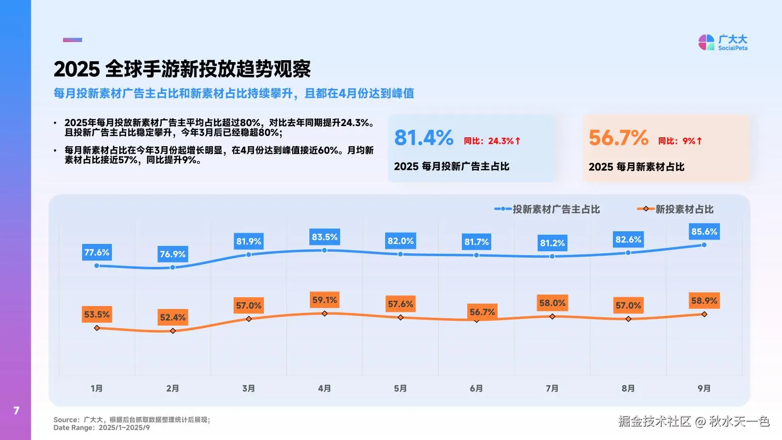 2025年Q1-Q3全球手游市场呈现出新趋势。每月投放新素材的广告主占比超80%,较去年同期提升超20%;从素材端看,月均新素材占比超过一半,同比增长9%。这意味着,光靠老素材循环投放已难以为继,快速更新广告、保持创意新鲜感,成了吸引玩家的关键。