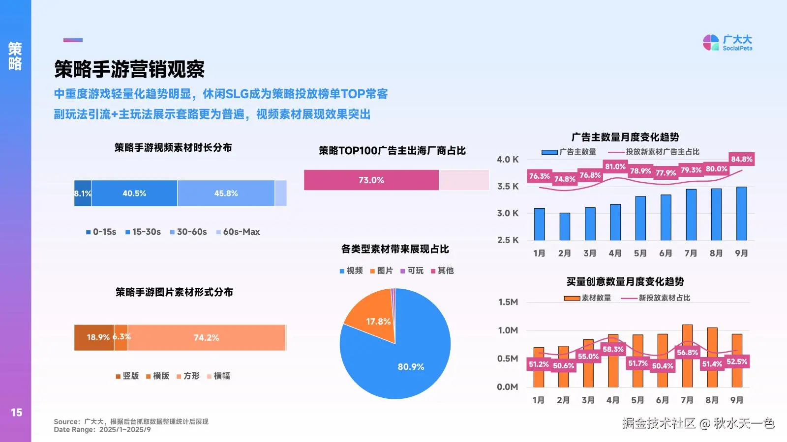 报告针对策略、RPG、模拟三类2025年中重度手游投放热门品类进行分析。以策略类手游为例,休闲SLG成为策略投放榜单TOP常客,副玩法引流+主玩法展示的套路更为普遍,视频素材展现效果突出,60s以内视频素材占90%以上,既能完整展示核心玩法,又能避免用户注意力流失。