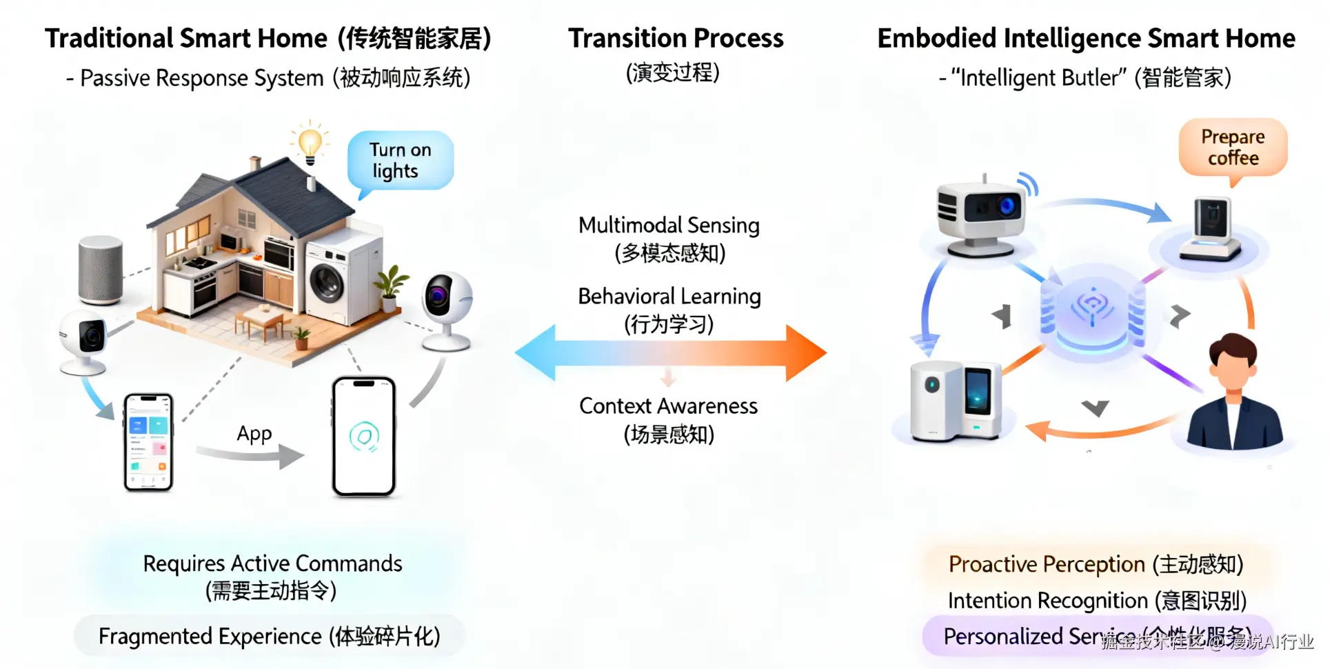 智能家居,被视为具身智能最先实现规模化落地、也是最贴近普通用户日常生活的应用场景之一。它正在经历一场深刻的演变:从一个由智能音箱、摄像头和各类智能家电组成的、需要用户主动发出指令的被动响应系统,进化为一个能够主动感知用户意图、提供个性化服务的“智能管家”。
