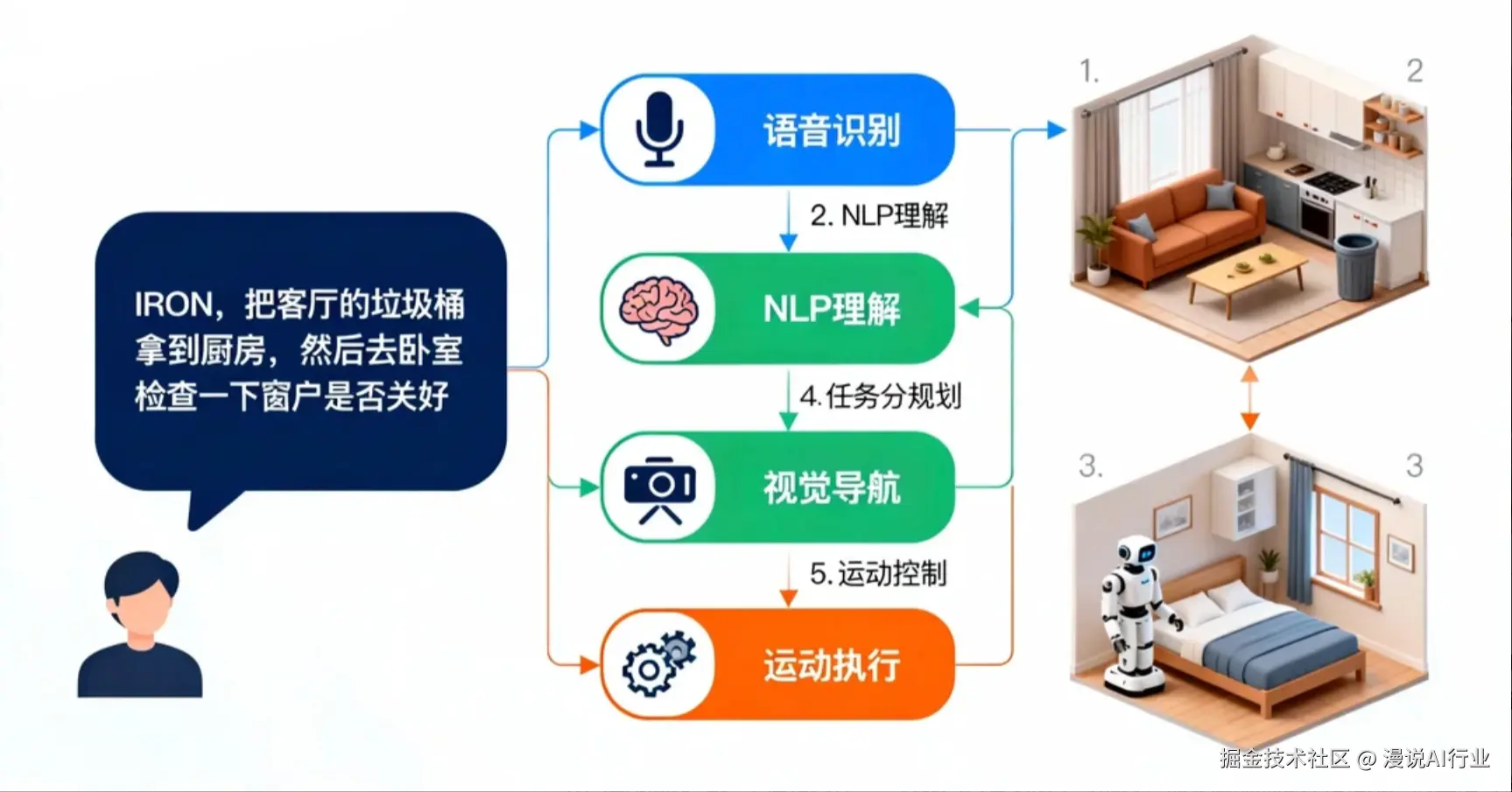 以小鹏汽车推出的家庭机器人IRON为例,它深度集成了具身智能技术,能够准确理解并执行复杂的自然语言指令。例如,用户可以直接说出:“IRON,把客厅的垃圾桶拿到厨房,然后去卧室检查一下窗户是否关好。” 机器人会自主进行视觉导航,定位垃圾桶和窗户的位置,并顺利完成移动与检查等一系列操作。这标志着家庭服务机器人从只能执行“开灯”、“播放音乐”等单一指令,跃迁到了能够完成“观察-移动-交互”的连续、复杂具身任务的新阶段。