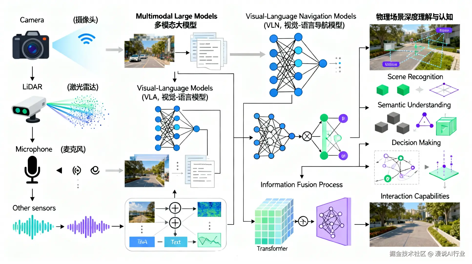 - 感知(Perception) : 具身智能体通过集成摄像头、激光雷达、麦克风等多种传感器来获取环境信息。其技术核心在于多模态大模型,例如视觉-语言模型(VLA)和视觉-语言导航模型(VLN),它们能够融合处理图像、文字、语音等不同模态的信息,实现对物理场景的深度理解与认知。