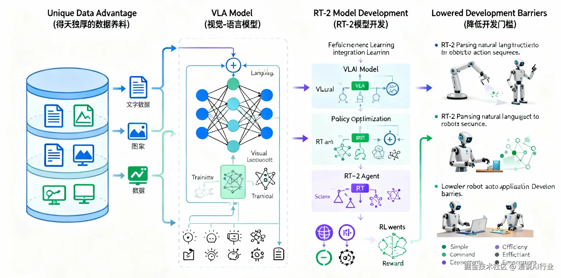 - 驱动多模态大模型的创新与普及: 互联网公司拥有海量的文本、图像、视频数据,这为训练性能强大的多模态大模型提供了得天独厚的养料。例如,通过将VLA模型与强化学习技术结合,已经能训练出像RT-2这样的先进模型,使其可以直接解析自然语言指令并生成可执行的机器人动作序列,极大地降低了机器人应用的开发门槛。