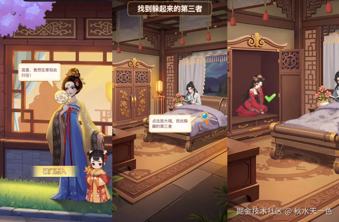 除了免费真花的鬼才营销爆火出圈外,【我的花园世界】还有非常扎实的买量功底。先看古代卖花剧情设定,估计不少人会很快联想到大热电视剧《国色芳华》。经典的离婚带娃妈也让人联想起那个最经典的“雪地破屋拯救悲惨母女”的买量广告,还有化妆类小游戏最爱的抓奸剧情,【我的花园世界】十分狡猾地将这些热门元素全部塞进剧情开头第一章第一节,集万千狗血热辣于一身。