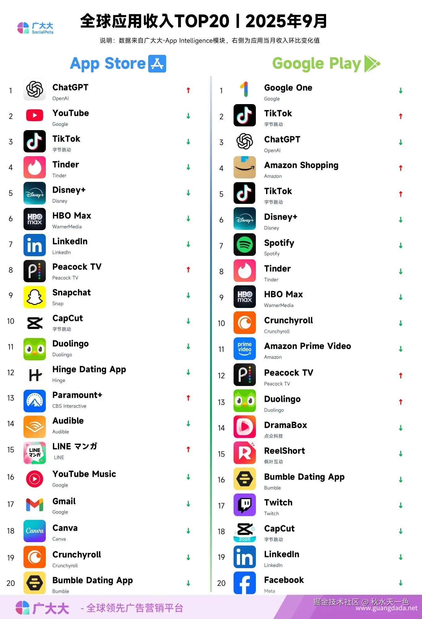 根据广大大 App Intelligence 等模块数据,笔者整理出2025年9月移动应用(非游戏)出海投放、全球收入和下载TOP20榜单,帮助更多移动应用从业人员了解全球移动市场变化趋势。