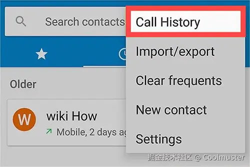 - 点击搜索栏上的三个点,然后选择“通话记录”。