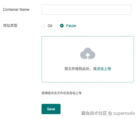 下图为使用 FatJar 创建容器的示例,需要上传可用的 FatJar(注:FatJar 内必须包含了所有依赖的 Jar 文件)