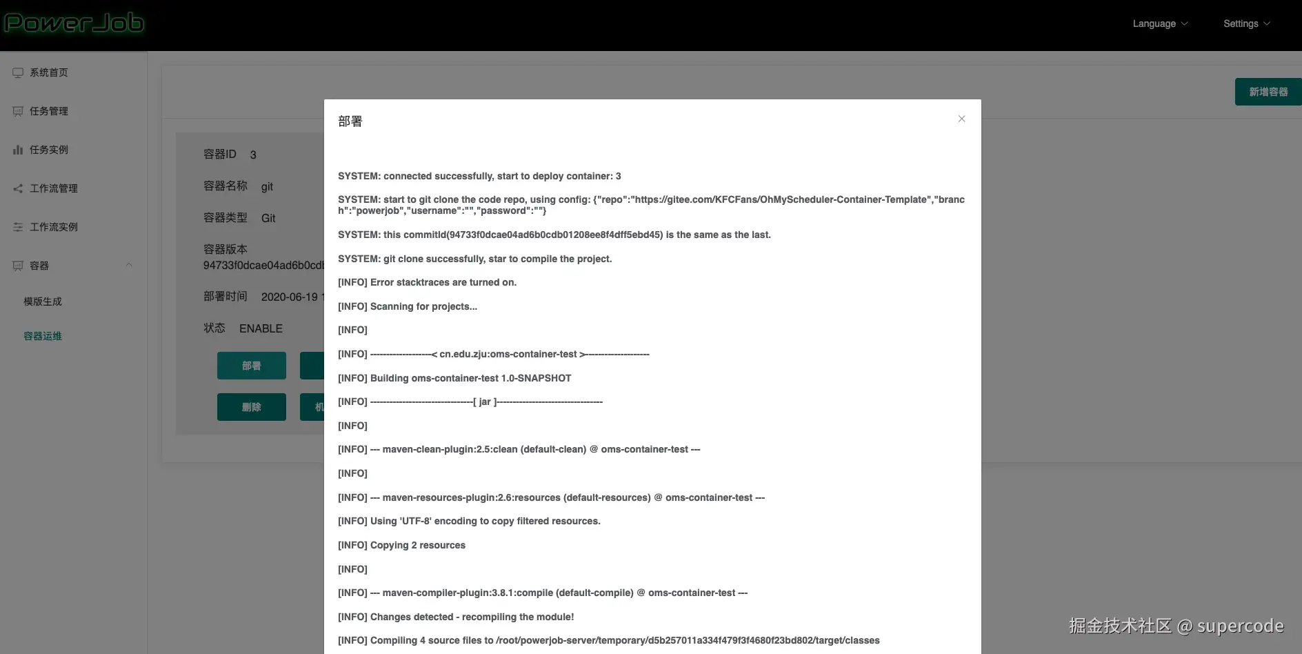每次创建和修改容器后,都需要进行一次部署(相当于发布该容器的最新版本),使 powerjob-worker 动态加载容器内的 Processor。点击部署,可以看到详细的部署信息。