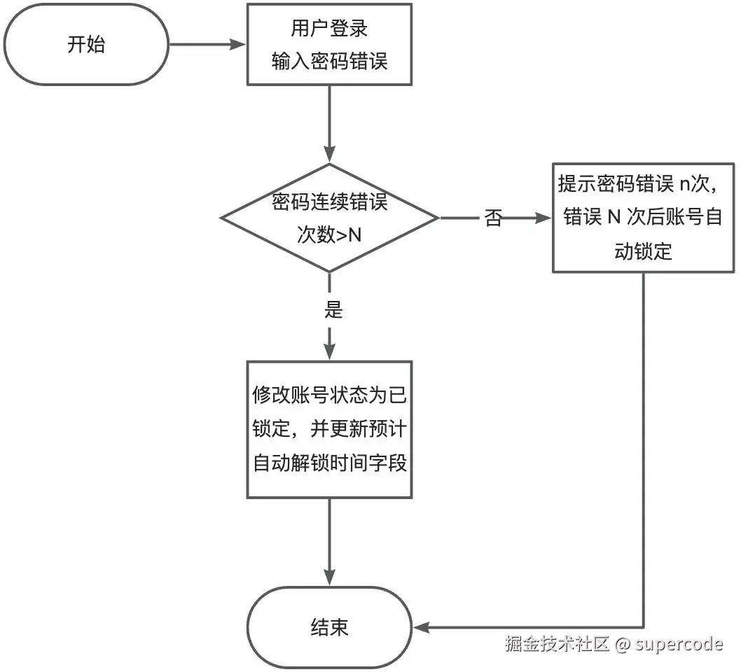 - 登录密码错误时,判断是否满足锁定的条件,如满足错误次数 > N,则将账号状态改为锁定,并添加一个异步的自动解锁任务,时间差为 Y 分钟。