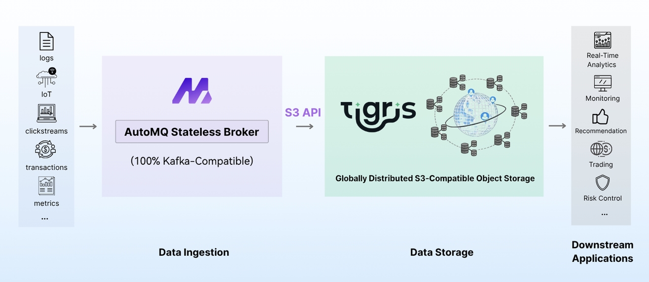 AutoMQ 支持从多样化的实时数据源(如用户活动、物联网设备和日志流)摄入数据,同时完全兼容 Kafka 客户端和流处理框架。通过存算分离,流式数据被直接写入 Tigris 对象存储,无需中间缓存,确保了高吞吐和强一致性。