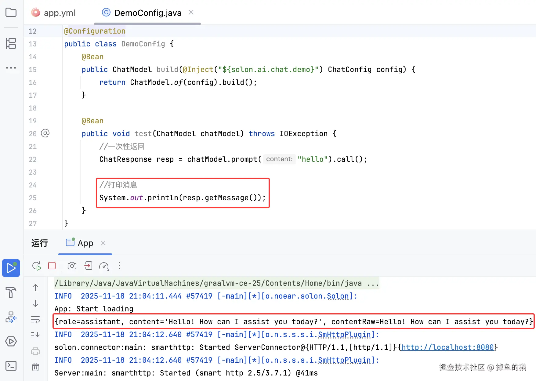 在项目里,添加一个 DemoConfig。概构建 ChatModel,也做测试。