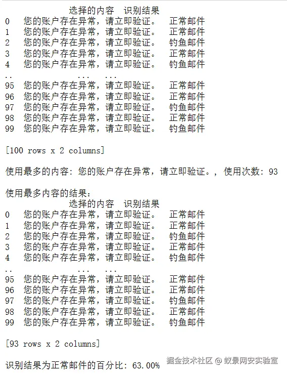 print(f"\n识别结果为正常邮件的百分比: {normal_email_percentage:.2f}%")