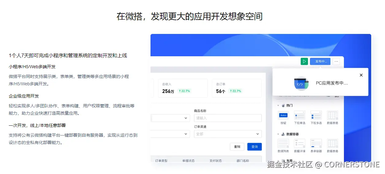 拓展能力: 平台以零代码为主,降低了使用门槛,同时也为开发者提供了自定义组件、开放API和逻辑模板等扩展方式,以满足更复杂的业务场景需求。