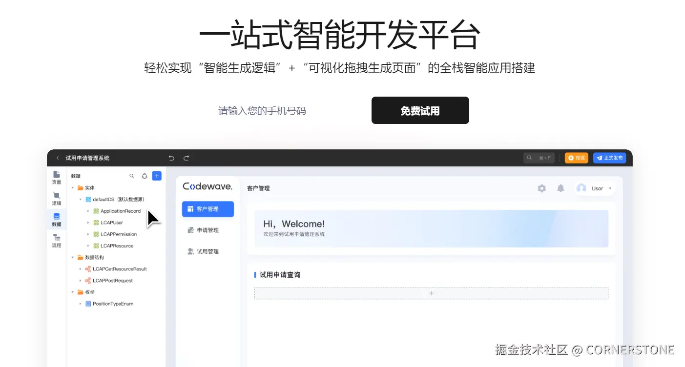 平台简介: 网易CodeWave智能开发平台以“全栈、开放、云原生”为核心,主打全栈可视化开发,旨在让开发者在可视化界面中完成前端、后端和数据库的全链路开发,实现复杂应用的无代码构建。