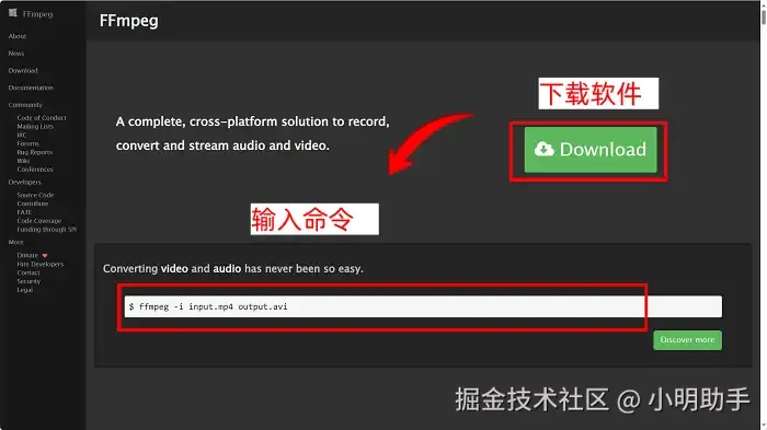 FFmpeg将音视频格式转换的操作步骤如下: 安装软件后,命令行输出命令,如ffmpeg -i input.mp4 output.avi——回车即可执行命令。