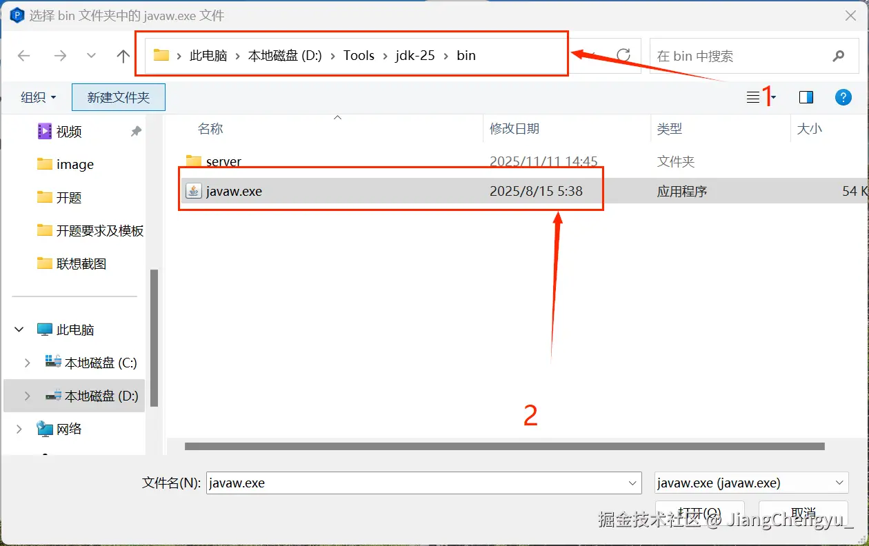 (在打开的文件选择窗口中找到自己放置的jdk文件夹路径,然后在jdk下找到jdk\bin\javaw.exe,双击选择)