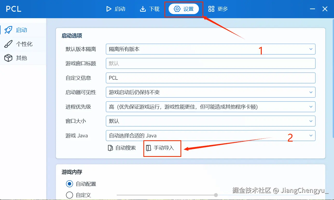(打开PCL2,点击设置,点击手动导入)