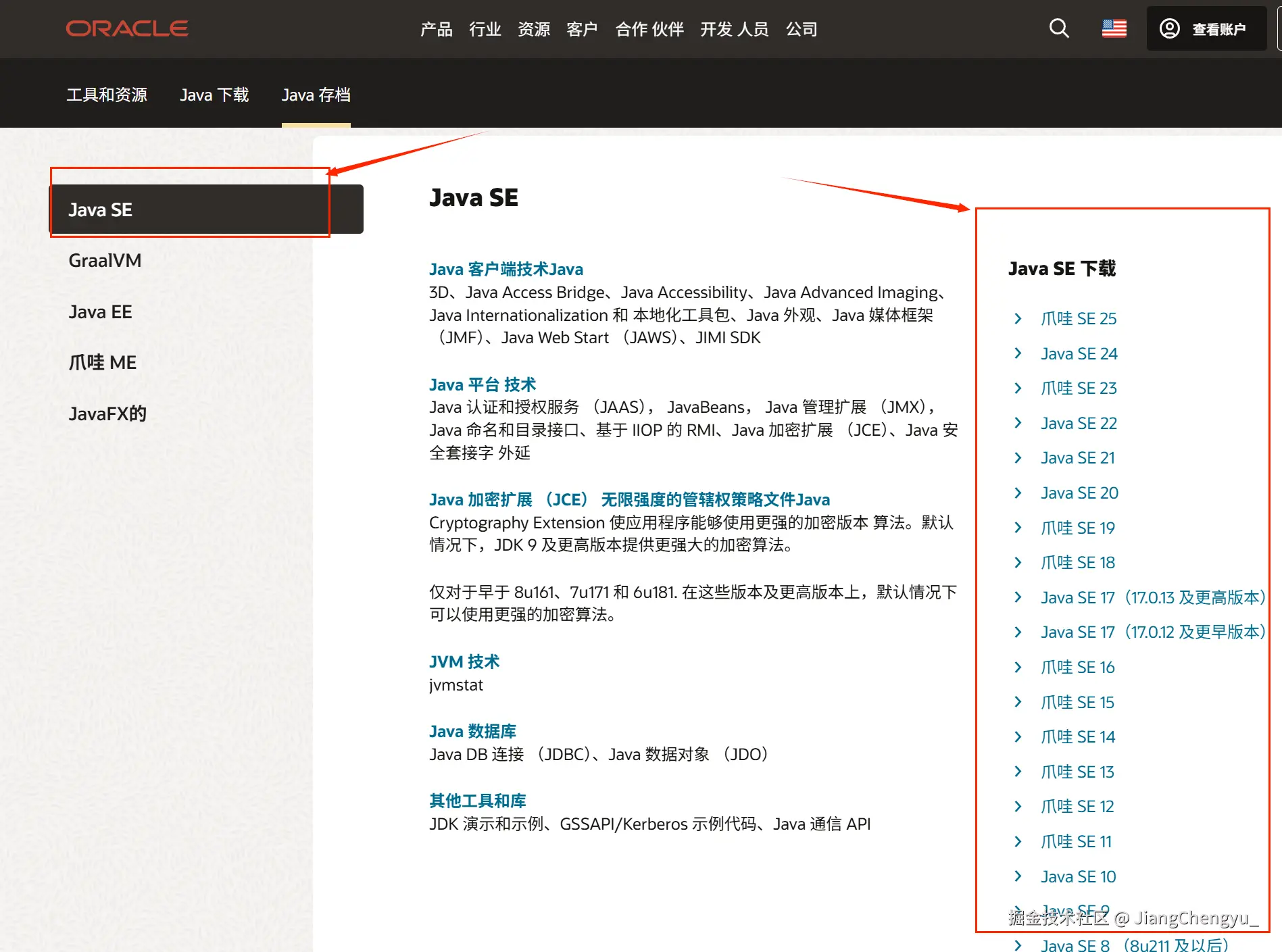 (浏览器往下翻,点击Java SE,右边展示的即为各个版本的Java)