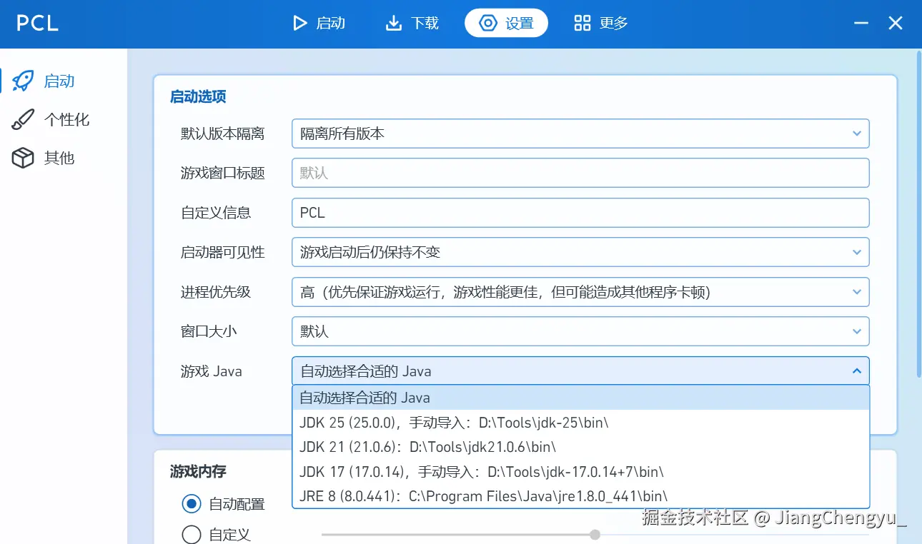 (注:启动Mc报错时,若是缺少Java的问题,则会提示您需要的Java版本,根据提示,在此选择自己的Java版本; 这边我以Java25为例,继续展示Java的下载与配置)