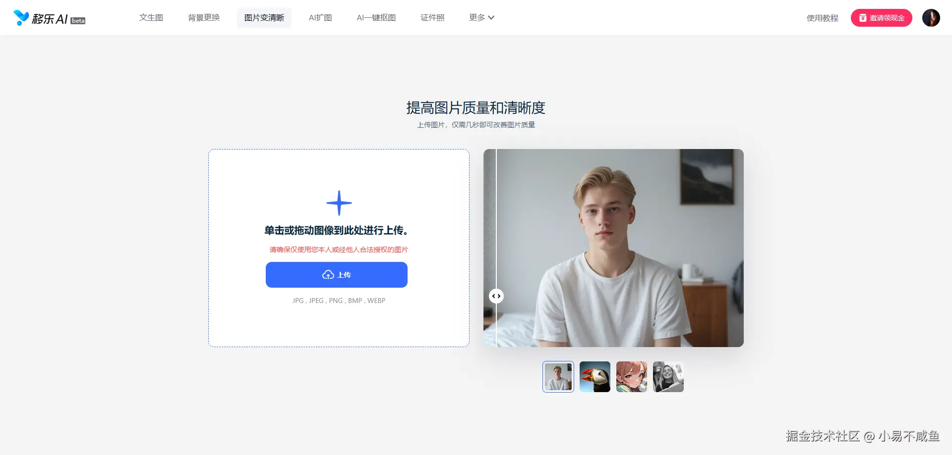 步骤1.上传图片:网页搜索并打开“移乐AI网站”,进入“图片变清晰”功能区,或直接店家“移乐AI图片变清晰”进入,点击“上传”按钮或直接拖拽图片至上传区域,支持JPG、PNG等多种常见格式。