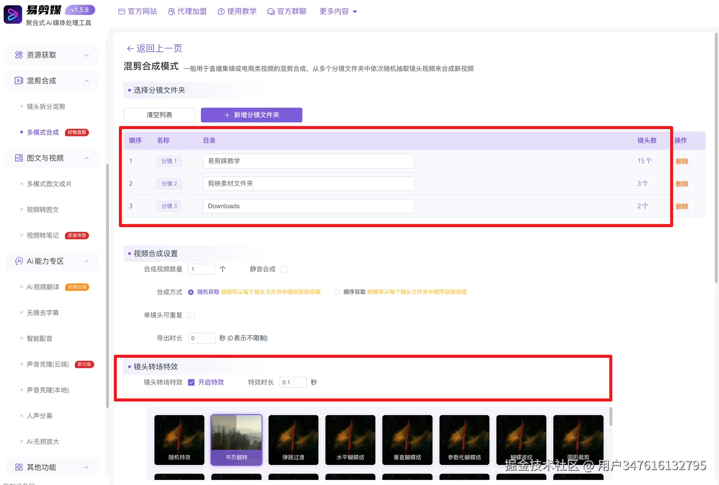 此外,【混剪合成】功能同样令人惊艳,可实现多镜头无缝拼接,并支持添加丰富的特效效果。