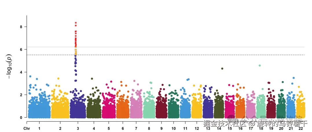 展示SNP与表型的关联性,图中每个点代表一个SNP,y轴代表其与表型的关联强度(通常是log(p-value)),越高的点表示关联越强。