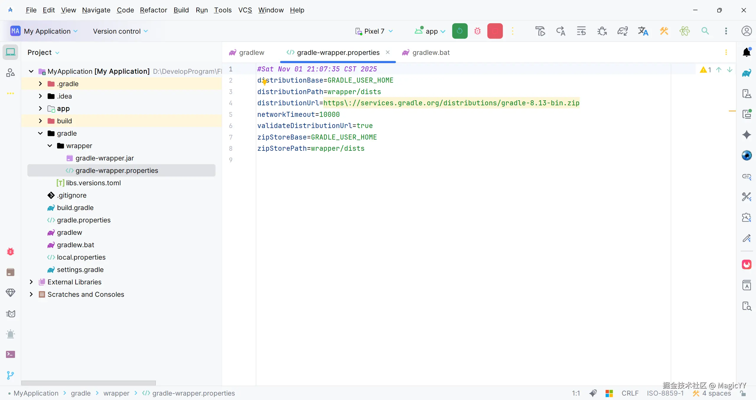 wrapper/gradle-wrapper.properties- 指定使用的Gradle版本,被Gradle包装器运行时读取。构建项目时会自动根据gradle-wrapper.properties属性查找是否下载相应的gradle版本,如果没有就distributionUrl的网址