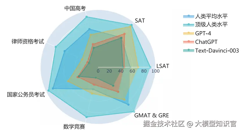 通过AGIEval,研究人员对GPT-4、ChatGPT、text-davinci-003等模型进行了评估。结果显示,GPT-4在SAT、LSAT和数学竞赛中的表现超越了人类平均水平。例如,GPT-4在SAT数学考试中的准确率为95%,在中国高考英语科目中的准确率达到了92.5%。