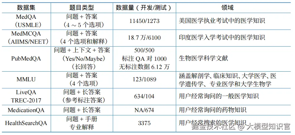- 医疗领域:在医疗领域,大语言模型被评估在临床问题解答、医学知识应用等方面的表现。数据集如MedQA 和 PubMedQA 用于评估模型的医学问答能力。而MultiMedQA 则通过集成多个数据集,帮助综合评估模型在不同医学场景中的表现。