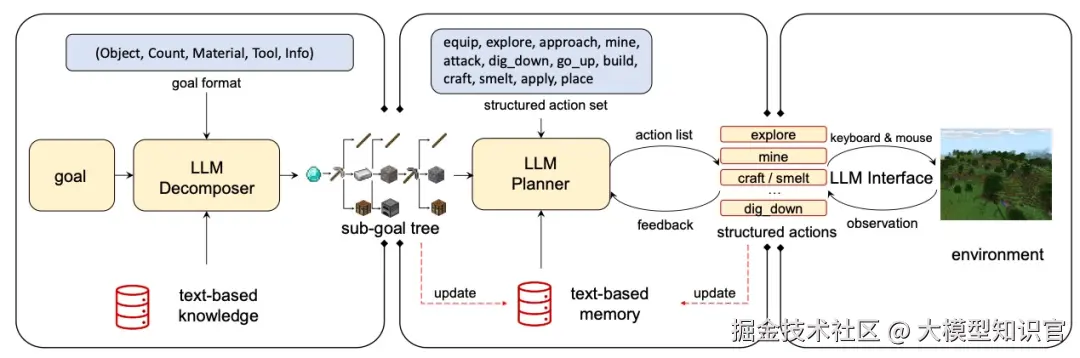 - 开放世界探索:除了受限环境,模型还可以在更开放的世界中执行任务。GITM 作为一个例子,测试模型在Minecraft 游戏中的能力,如何根据任务分解、规划和反馈调整行动,模拟复杂的环境交互。