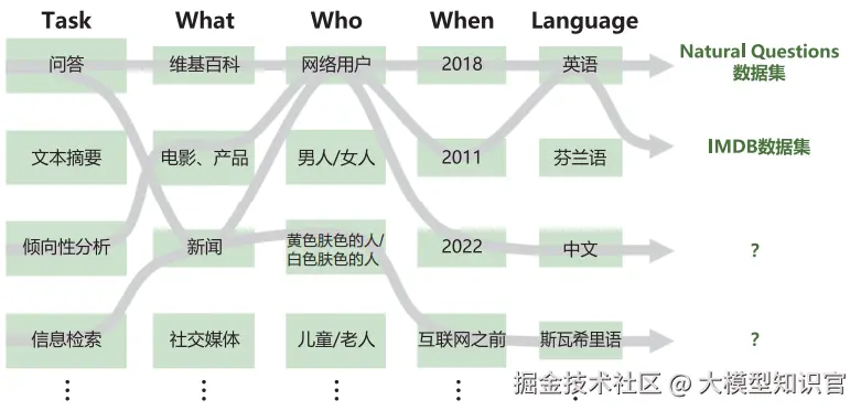 HELM(Holistic Evaluation of Language Models)评估体系构建了42类评估场景(Scenario),并通过三个维度对场景进行分类: