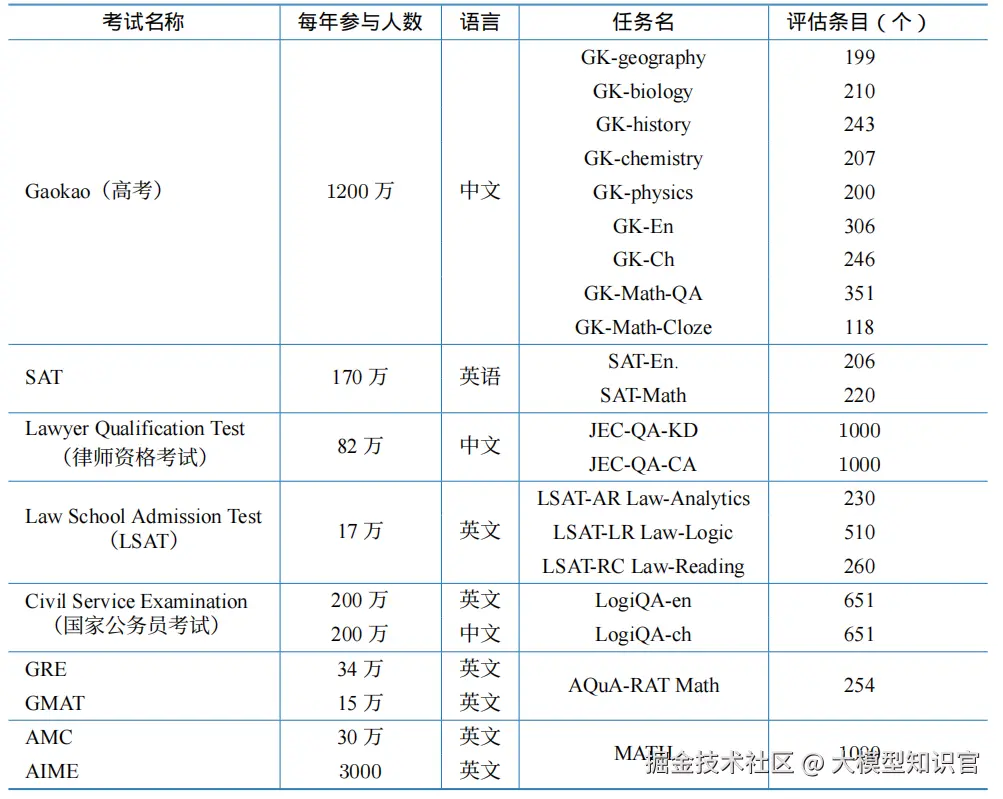 AGIEval的目标是选择那些与人类认知和问题解决密切相关的任务,从而全面评估大语言模型的通用能力。它融合了多个高标准的入学和资格考试,这些考试具有广泛的参与度并得到官方认可,如中国的高考、美国的SAT、法学院入学考试(LSAT)、数学竞赛、律师资格考试等。