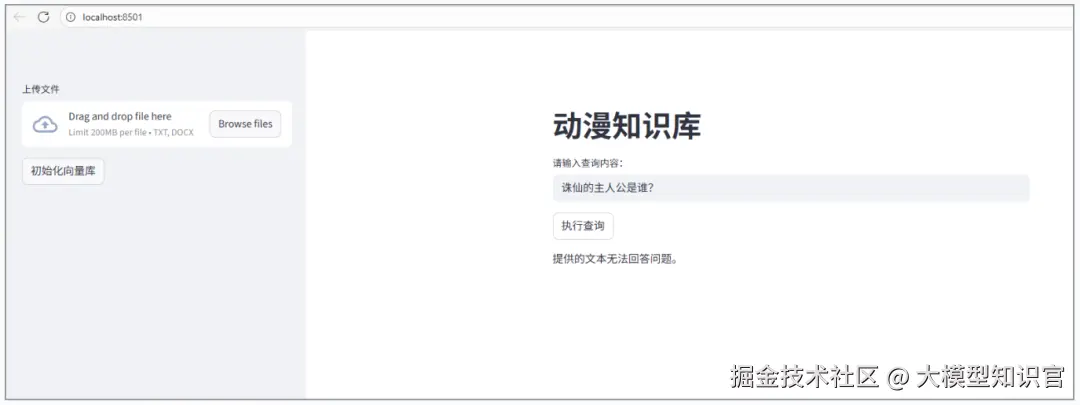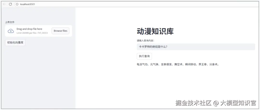 然后用Streamlit作为外部界面,构建一个可以查询和增加文档的小应用,也可以对向量库进行初始化,初始化的时候,系统会自动构建动漫龙珠的向量库,后续可以上传文档并添加新的知识。